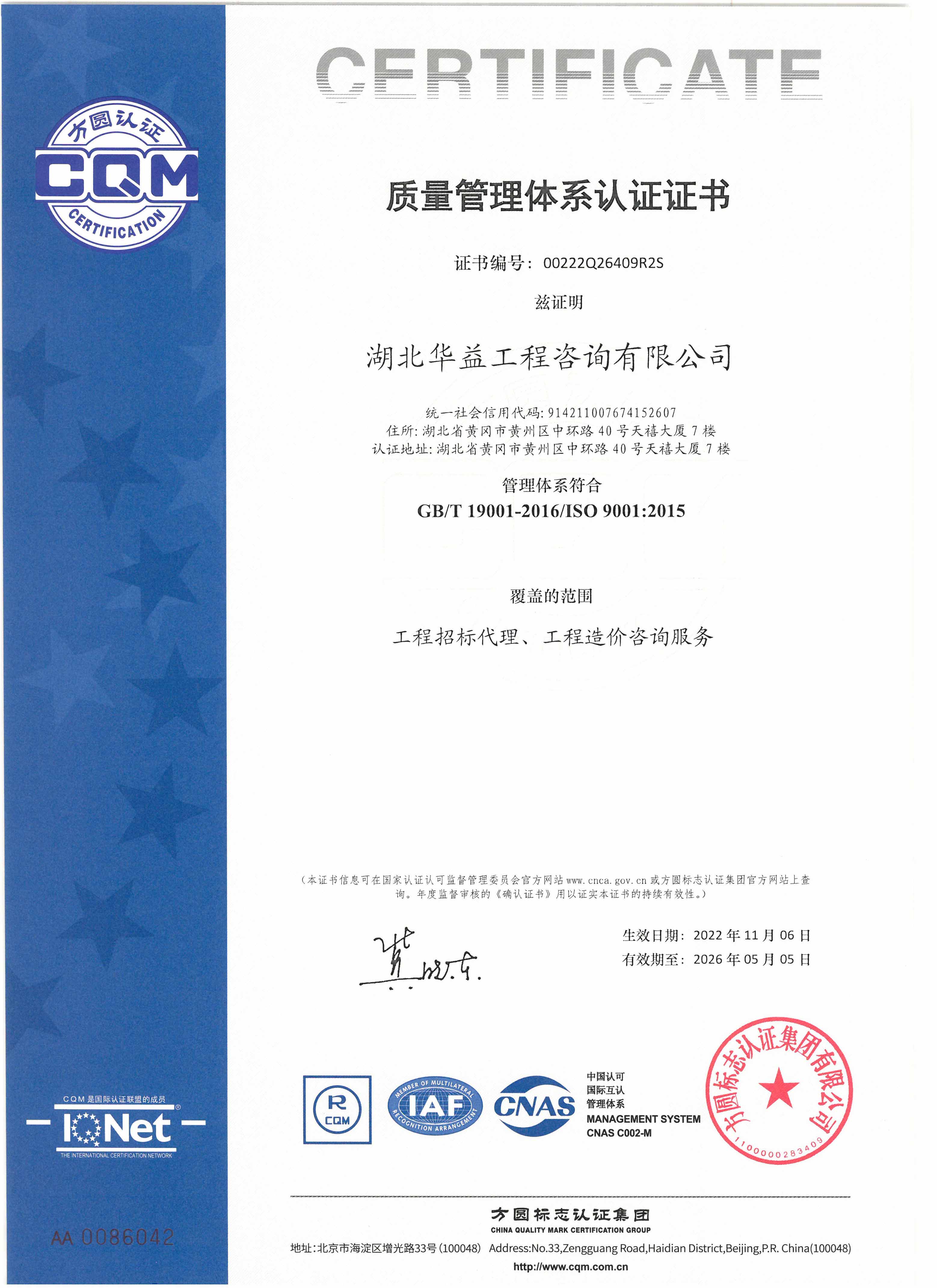質(zhì)量管理體系認(rèn)證證書