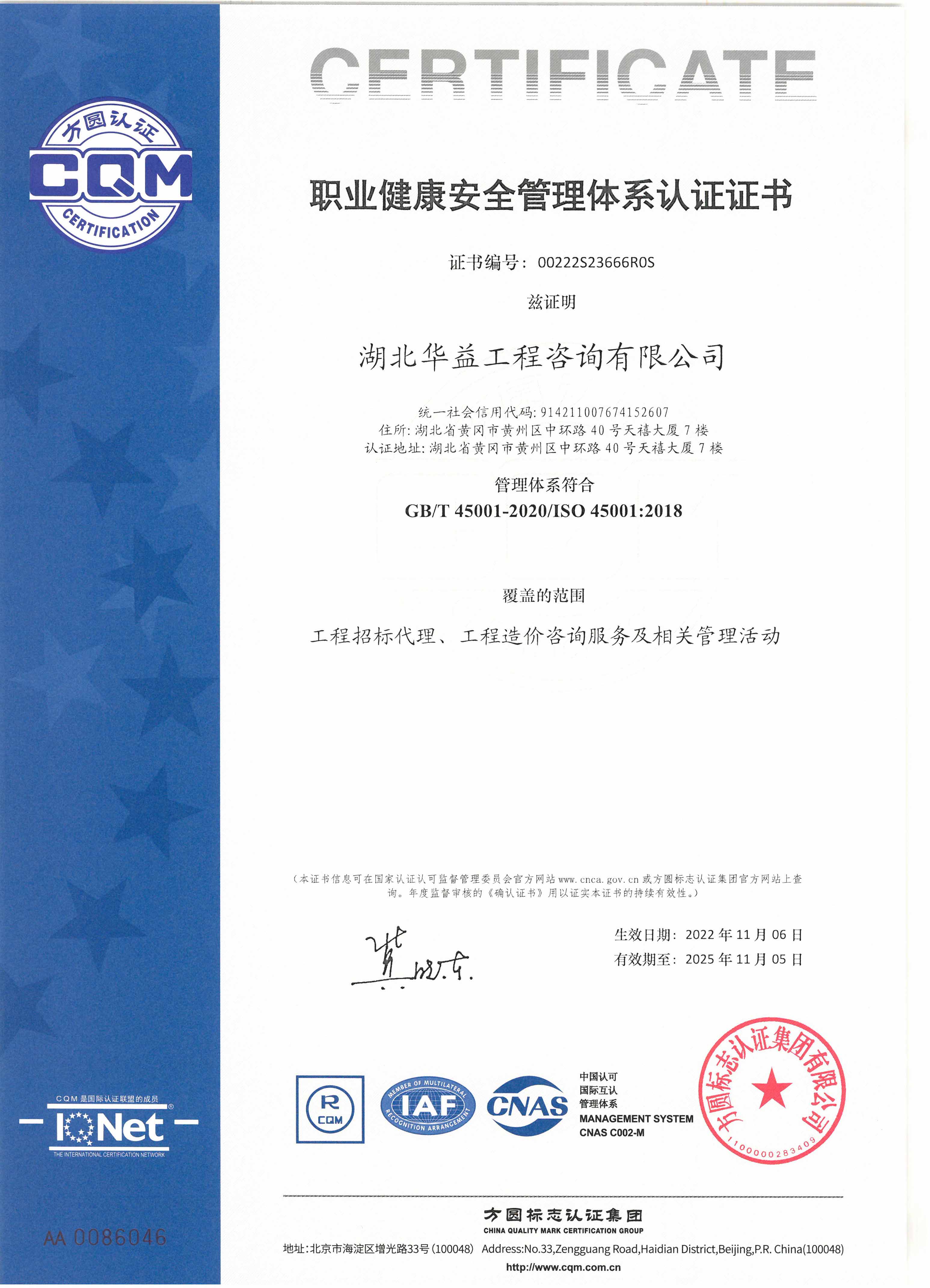 職業(yè)健康安全管理體系認(rèn)證證書